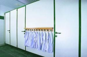 Plavecké areály, to nejsou jen bazény, brouzdaliště, skluzavky, ale také zázemí, kde se lidé sprchují, převlékají a odpočívají, než vyjdou ven na ulici. Je zpravidla tvořeno sanitárními příčkami, které se dají různě uspořádat. Architekti si mohou s materiály všeho druhu pohrát, vytvořit různé prostorové sestavy a zvolit vhodný materiál podle provozu, ve kterém budou sanitární příčky umístěny. Jde o desky z velmi odolného materiálu, s povrchovou úpravou v různých dekorech a barvách, vsazené do duralových rámů. Používají se jak v běžném prostředí, jako šatní skříňky nebo WC kabinky, tak v náročnějším, vlhkém prostředí, ve sprchách.